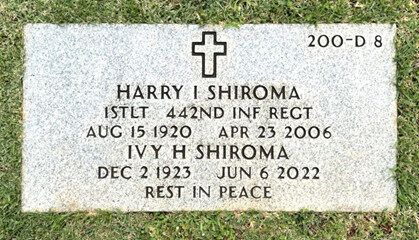 Harry Isamu Shiroma died on April 23, 2006, in Tripler Army Medical Center at the age of 85. He was a retired employee of the State Department of Education. Survivors included his wife Ivy and three sons. He was buried in the Hawaii State Veterans Cemetery in Kaneohe, Section 200-D, Plot 8. Ivy Shiroma died on June 6, 2022, and was buried next to her husband.