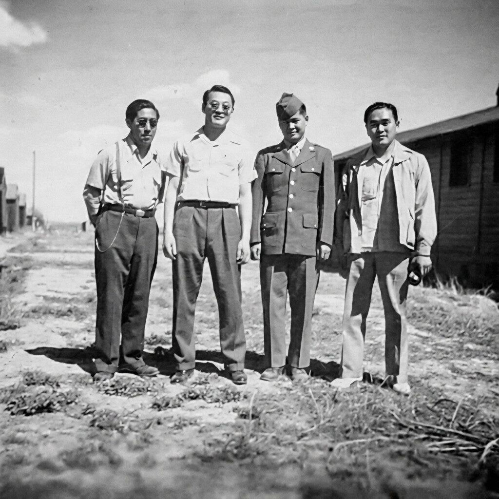 Below:  Tad Sato after enlisting; L to R:  Tak Hori, Bob Ikeda, Sato, Norio Mitsuoka, Minidoka, 1943