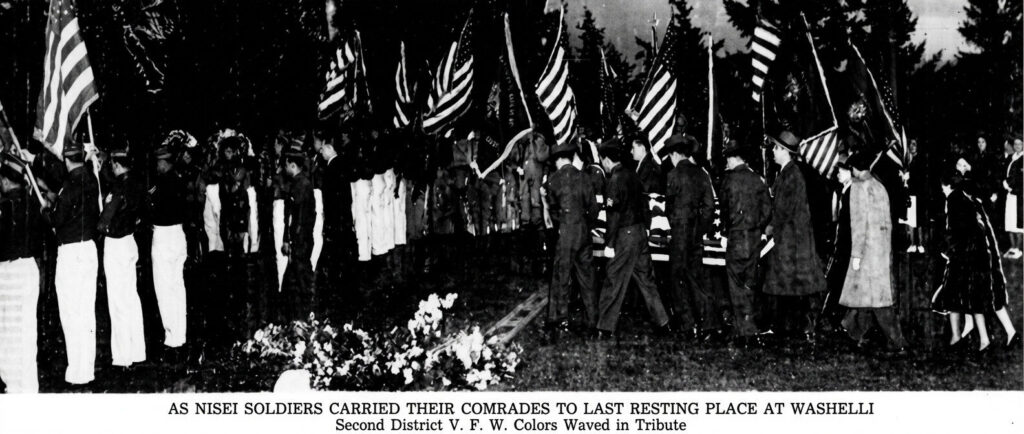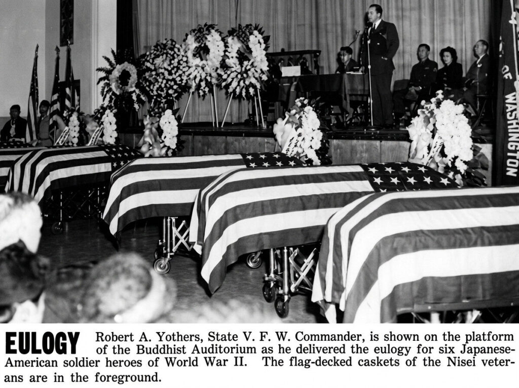 On December 11, 1947, the funeral service for Pfc. Tadao Sato, his brother Pfc. Yukio Sato, and four other 442nd soldiers was held in the Bukkyo-Kai Buddhist Auditorium at 14th Avenue South and Main Street.  Four clergymen alternately conducted the Buddhist and Christian rites in Japanese and English.  The eulogy was delivered by Robert A. Yothers, State Commander of the Veterans of Foreign Wars (VFW).  He ended with, “The highest tribute that we the living can pay to these men is to apply to our own lives the faith and undaunted courage which were theirs and to now dedicate ourselves in service to the living – that we now resolve that these Americans shall not have died in vain.”