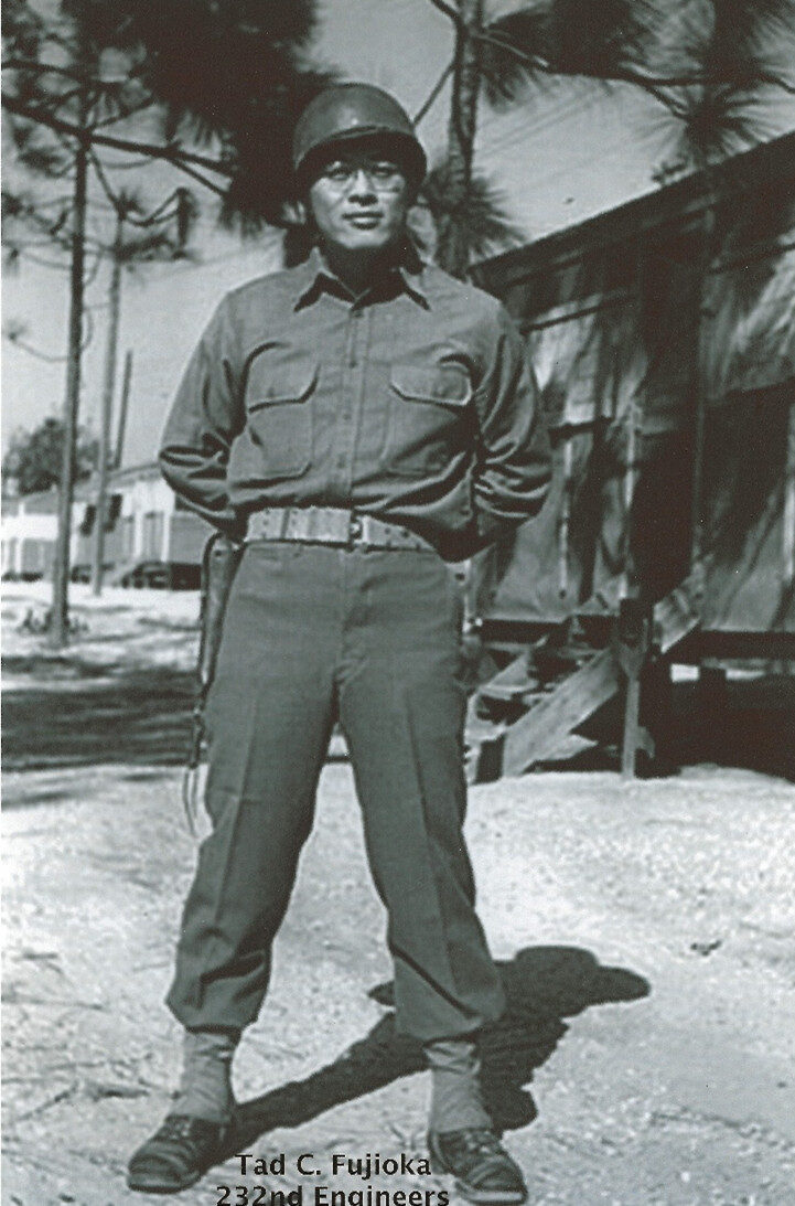 Fujioka enlisted in the U.S. Army on May 22, 1943, in Salt Lake City, Utah. He had completed two years of college and his address was given as Jerome, Idaho. He was sent to the 442nd RCT at Camp Shelby, Mississippi, where he was assigned to the 232nd Combat Engineer Company.