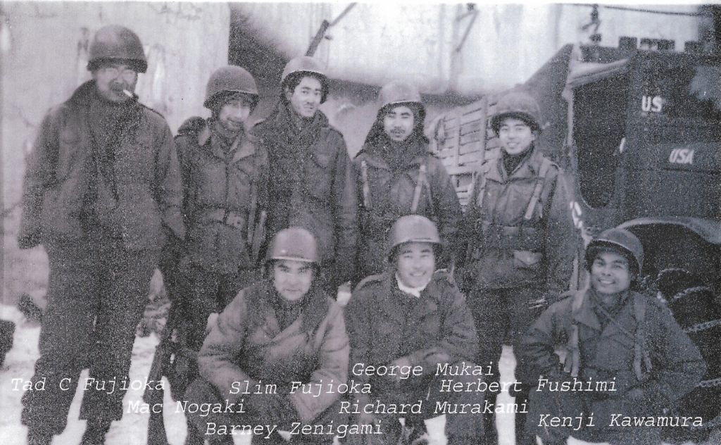 Below: 232nd men in France, 1944: Standing L to R – Tad C. Fujioka, Masayasu (“Mac”) Nogaki, Slim Fujioka, George Takashi Mukai, Herbert H. Fushimi; Kneeling L to R – Barney Seiso Zenigami, Richard T. Murakami, Kenji Kawamura