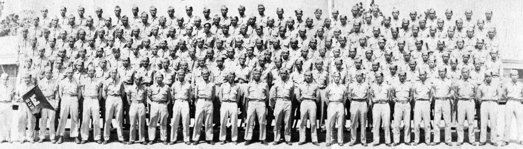 Below: 232nd Combat Engineers at Camp Shelby June 1943; Ogawa is 5th row down from the top, 9th from the left – he wrote his name above his head