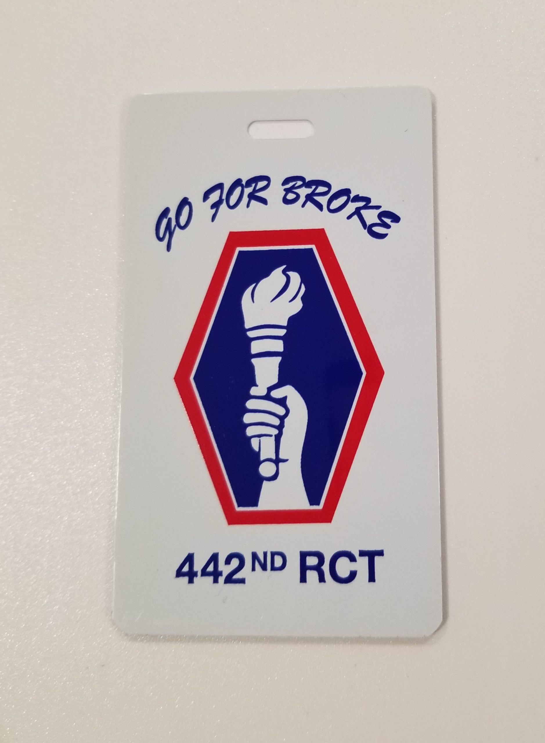 Travel in style with these luggage tags. They feature the 442nd torch logo and the words “Go For Broke” “442nd RCT”on the front, and a place to write your name & contact info on the reverse. Sold in sets of 2 tags with a clear plastic tie to secure to your luggage.