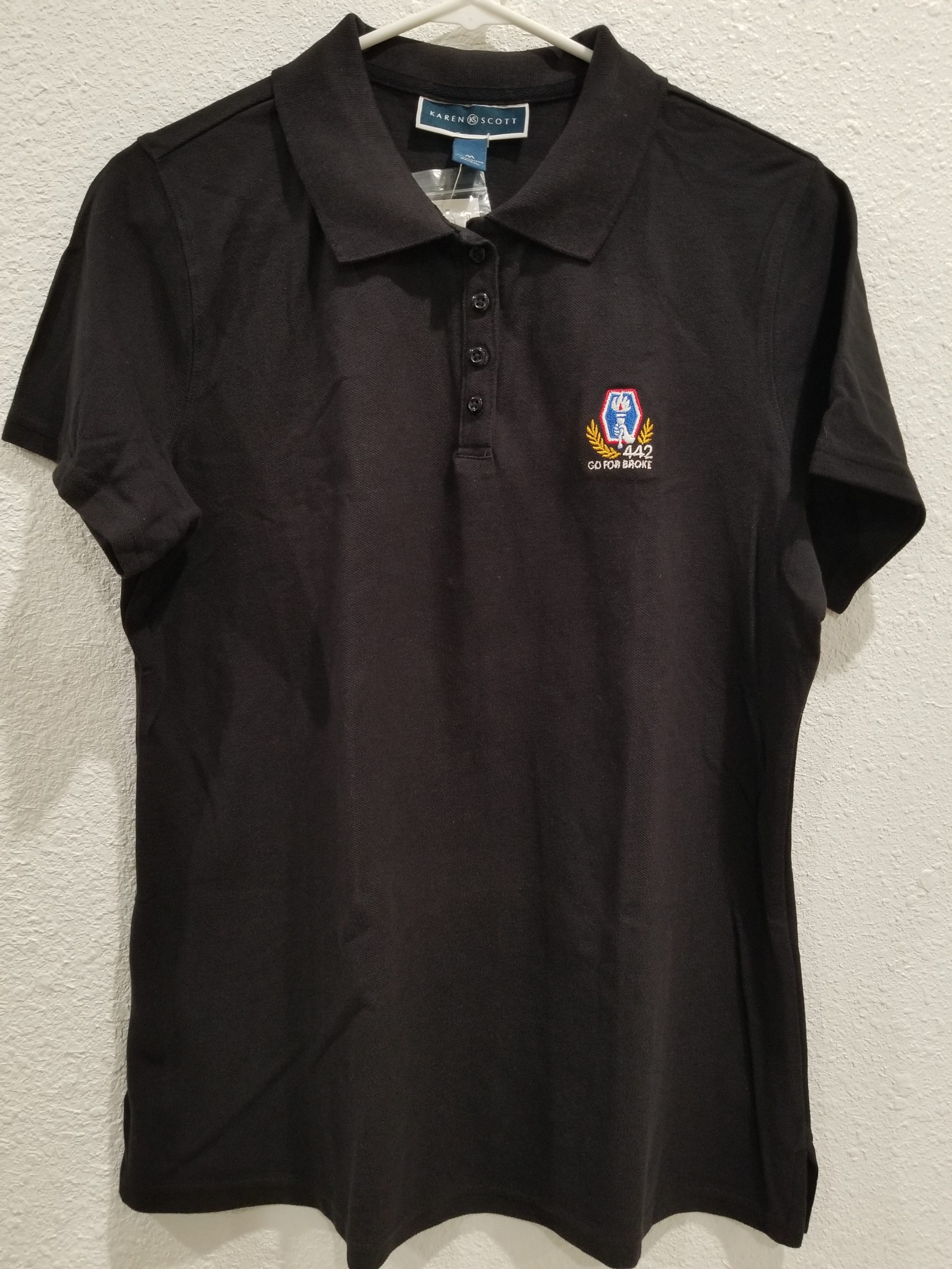 This is a ladies black polo shirt from Karen Scott. It’s 100% cotton and features the 442nd Torch Logo embroidered onto the left upper chest. Available only in medium.